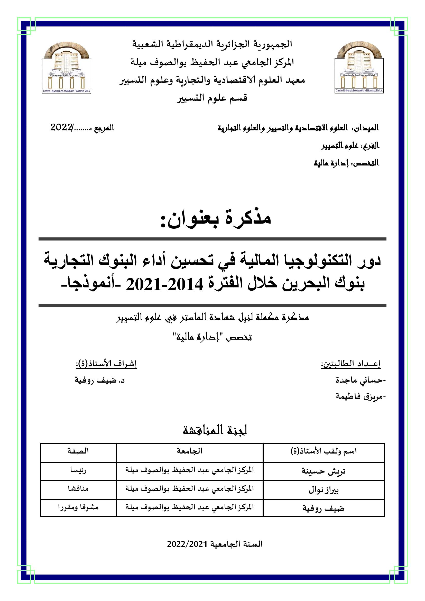 حساني ماجدة et al. (2022). دور التكنولوجيا المالية في تحسين أداء البنوك التجارية : بنوك البحرين خلال الفترة 2014-2021 - أنمودجا- (ماستر- ل م د) . ميلة.