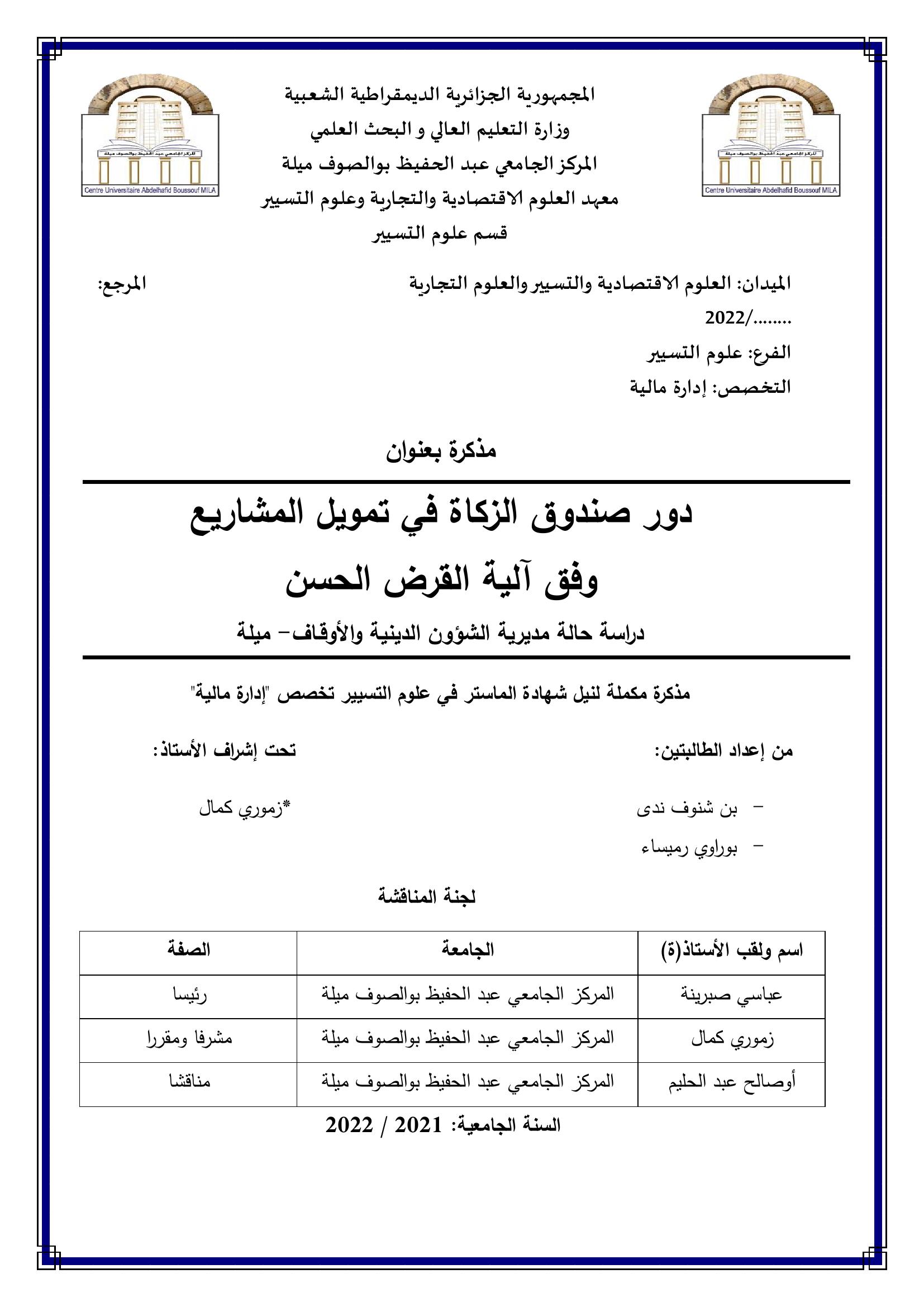بن شنوف ندى et al. (2022). دور صندوق الزكاة في تمويل المشاريع وفق آلية القرض الحسن دراسة حالة مديرية الشؤون الدينية والأوقاف ميلة (ماستر- ل م د) . ميلة.