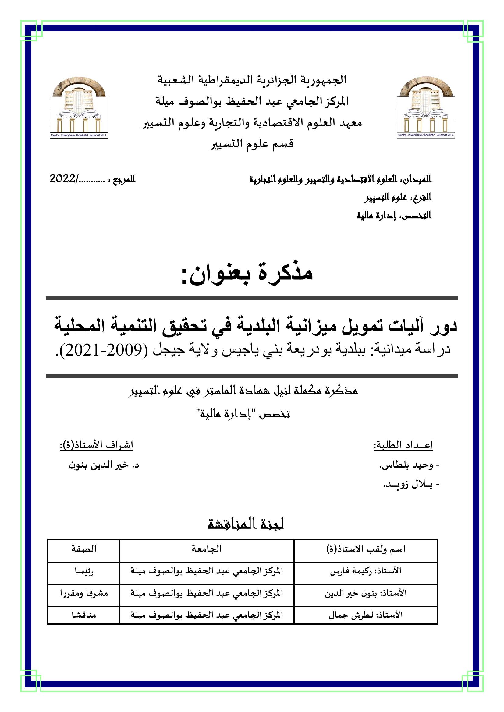 دور آليات تمويل ميزانية البلدية في تحقيق التنمية المحلية : دراسة ميدانية: ببلدية بودريعة بني ياجيس ولاية جيجل (2009-2021).