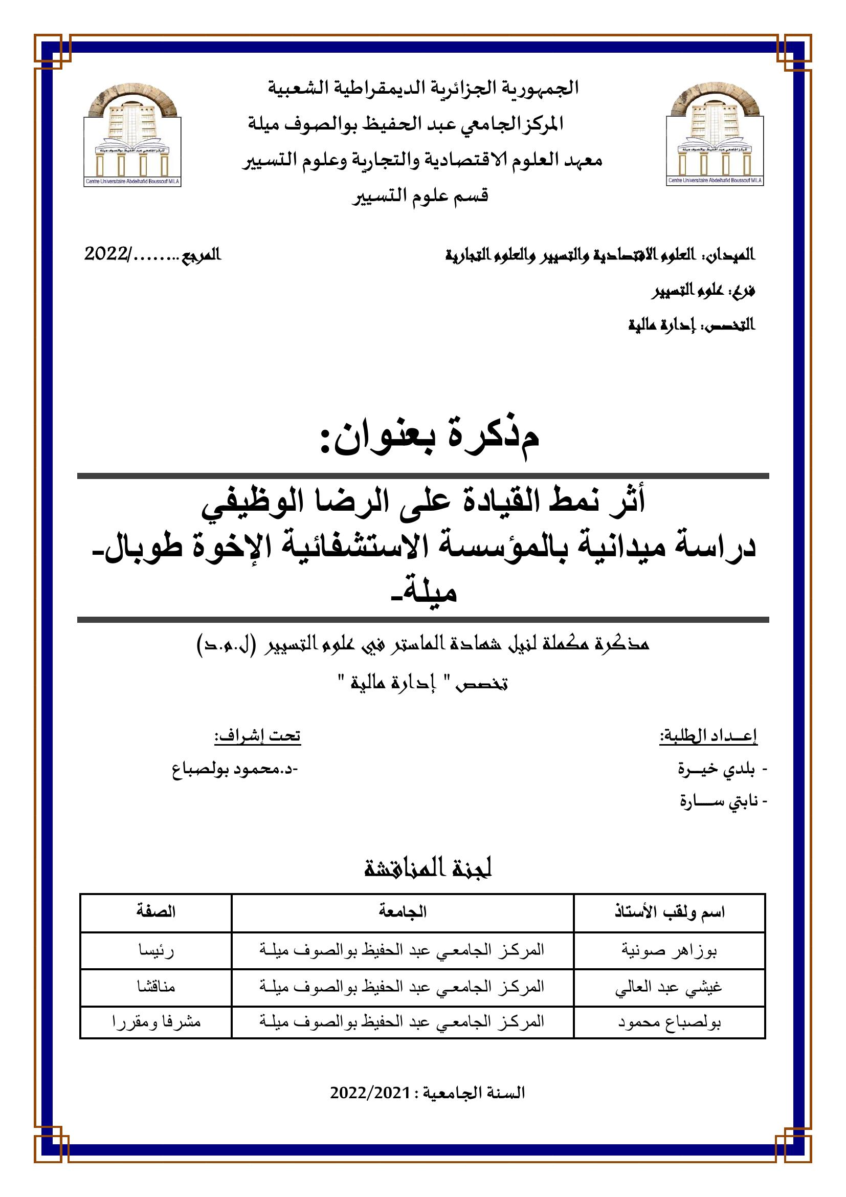 أثر نمط القيادة على الرضا الوظيفي : دراسة ميدانية بالمؤسسة الاستشفائية الإخوة طوبال- ميلة-