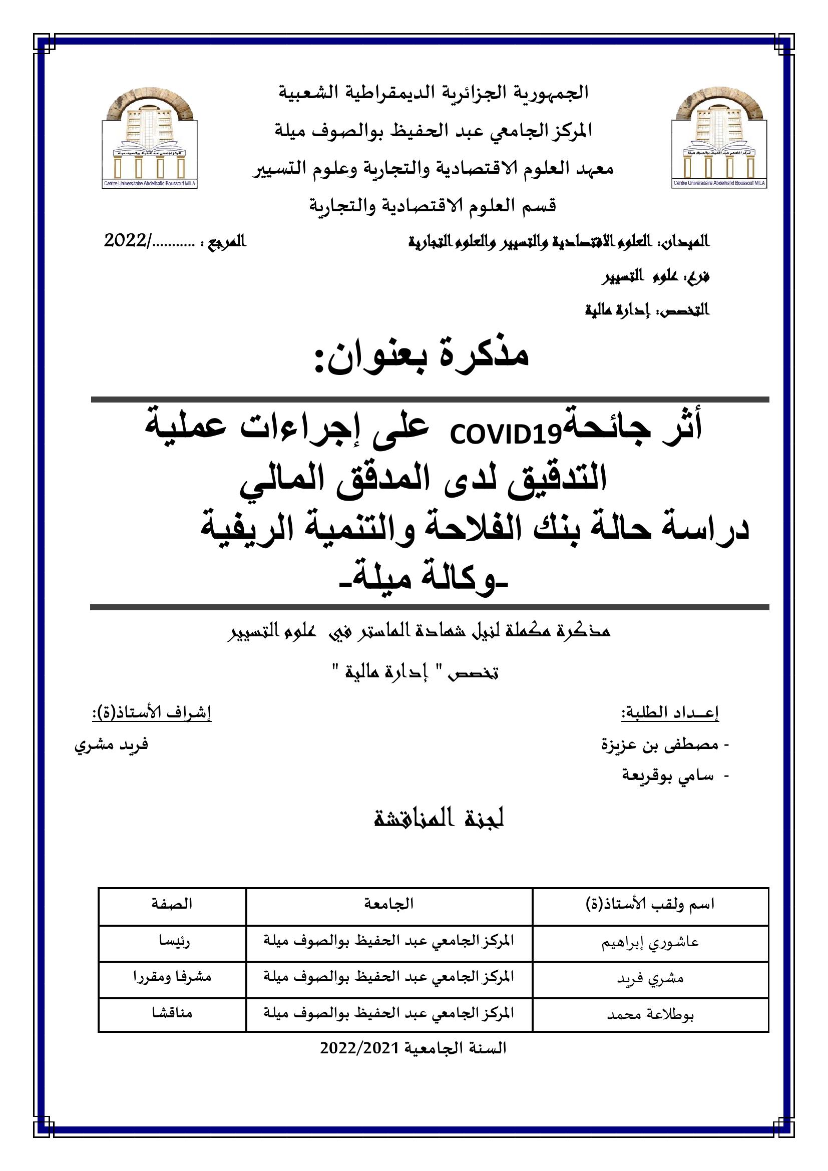 أثر جائحة COVID 19 على إجراءات عملية التدقيق لدى المدقق المالي : دراسة حالة بنك الفلاحة والتنمية الريفية - وكالة ميلة-