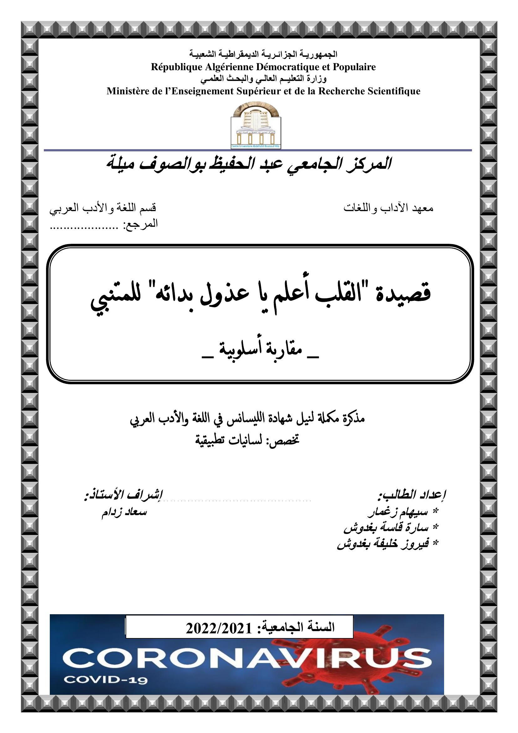 زغمار سهام et al. (2022). قصيدة القلب أعلم ياعذول بدائه للمتنبي - مقاربة أسلوبية-.
