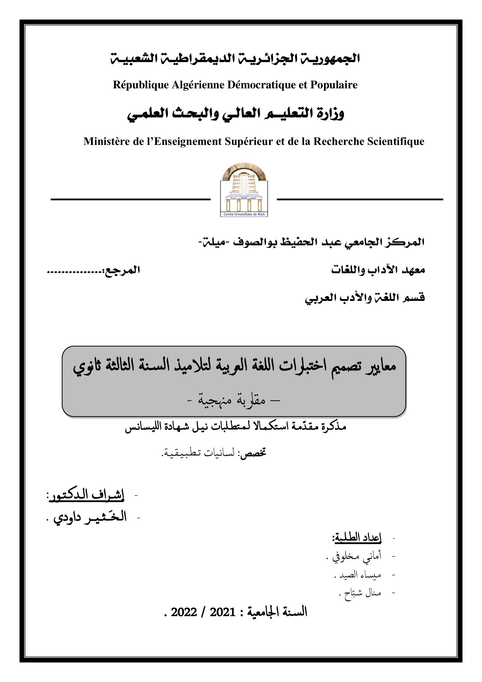 مخلوفي أماني et al. (2022). معايير تصميم اختبارات اللغة العربية لتلاميذ السنة الثالثة ثانوي -مقاربة منهجية-.