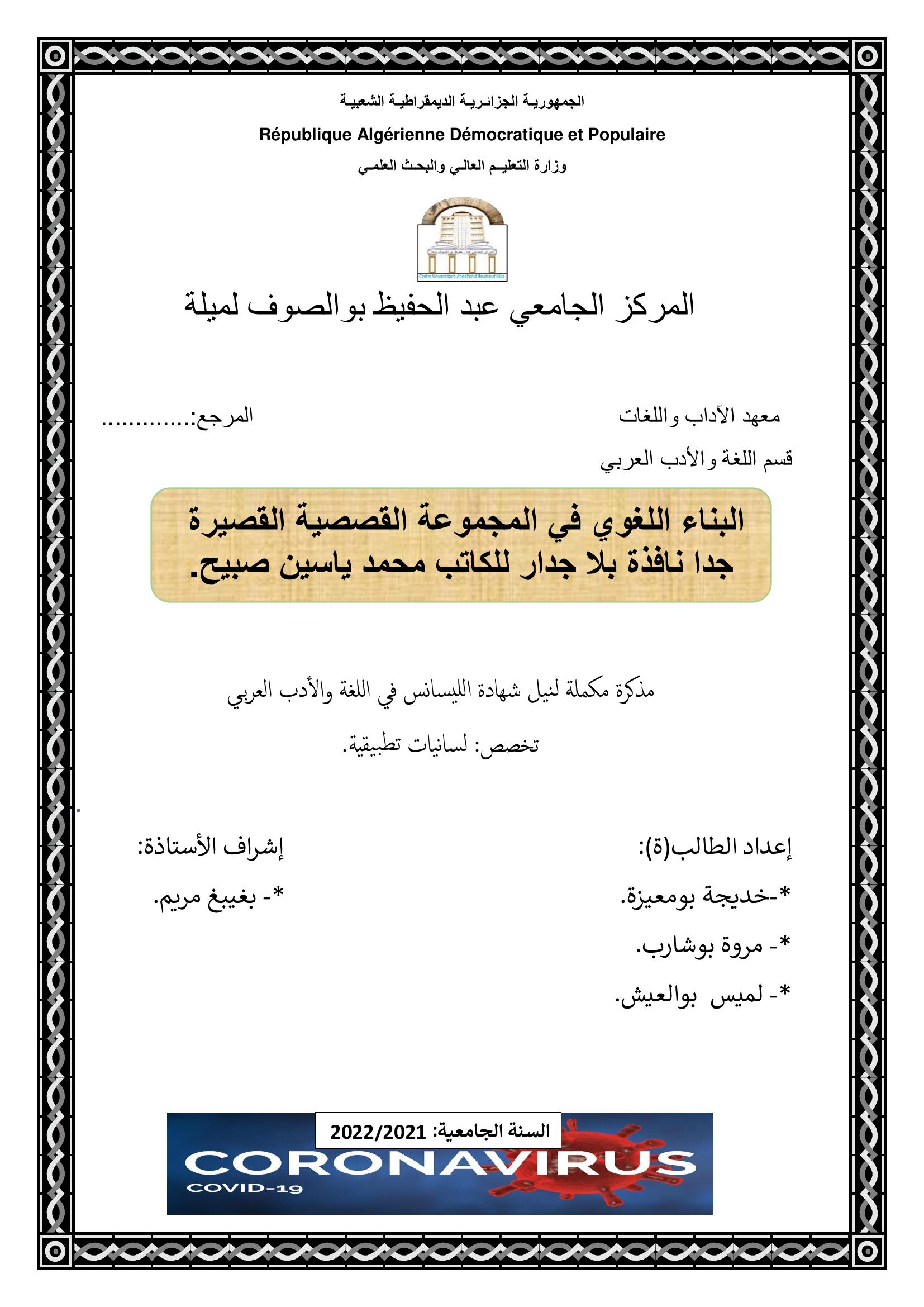 بومعيزة خديجة et al. (2022). البناء اللغوي في المجموعة القصصية القصيرة جدا -نافذة بلاجدار لمحمد ياسين صبيح.