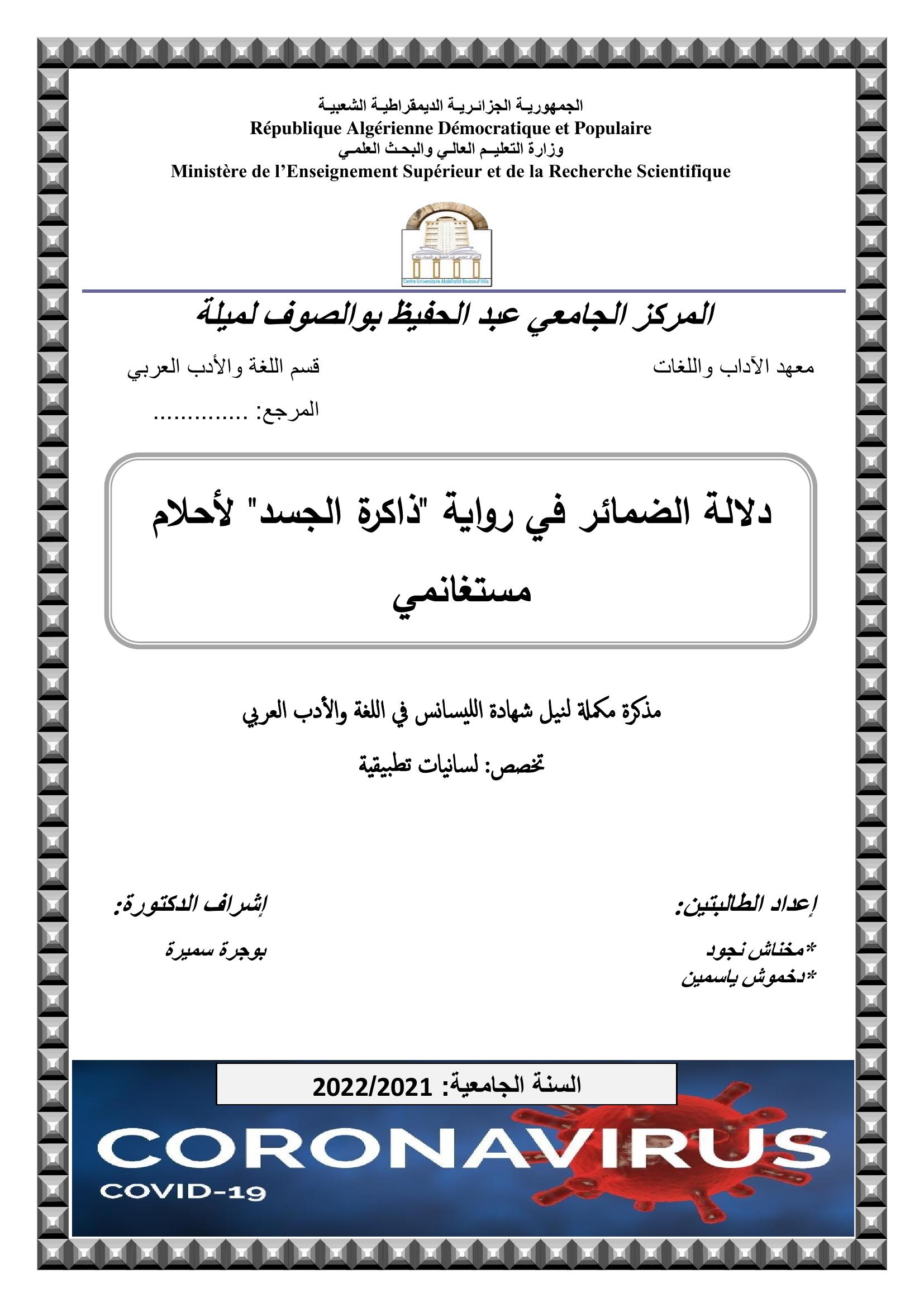 مخناش نجود et al. (2022). دلالة الضمائر في رواية -ذاكرة الجسد لأحلام مستغانمي.