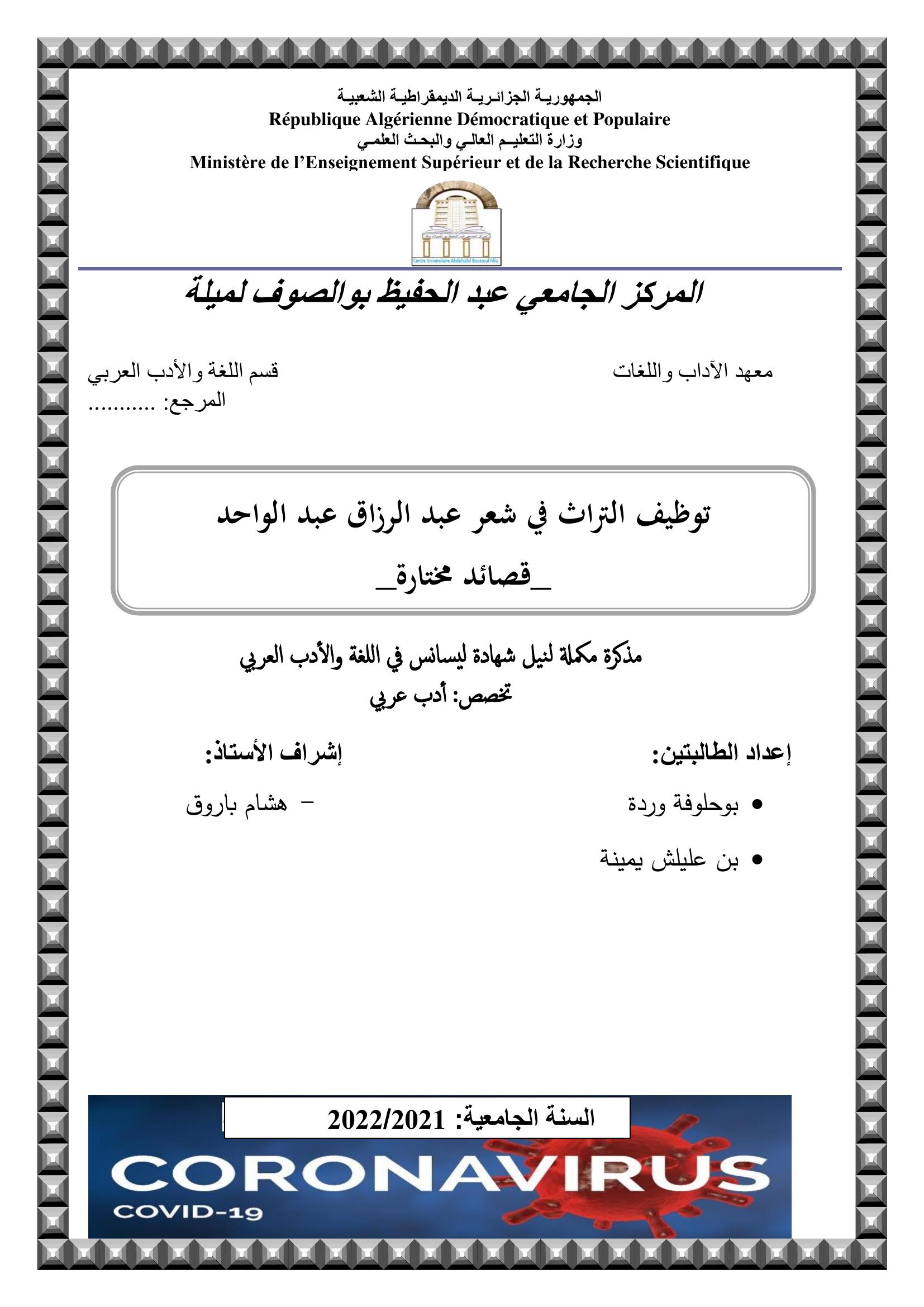 بوحلوفة وردة et al. (2022). توظيف التراث في شعر عبد الرزاق عبد الواحد -قصائد مختارة-.