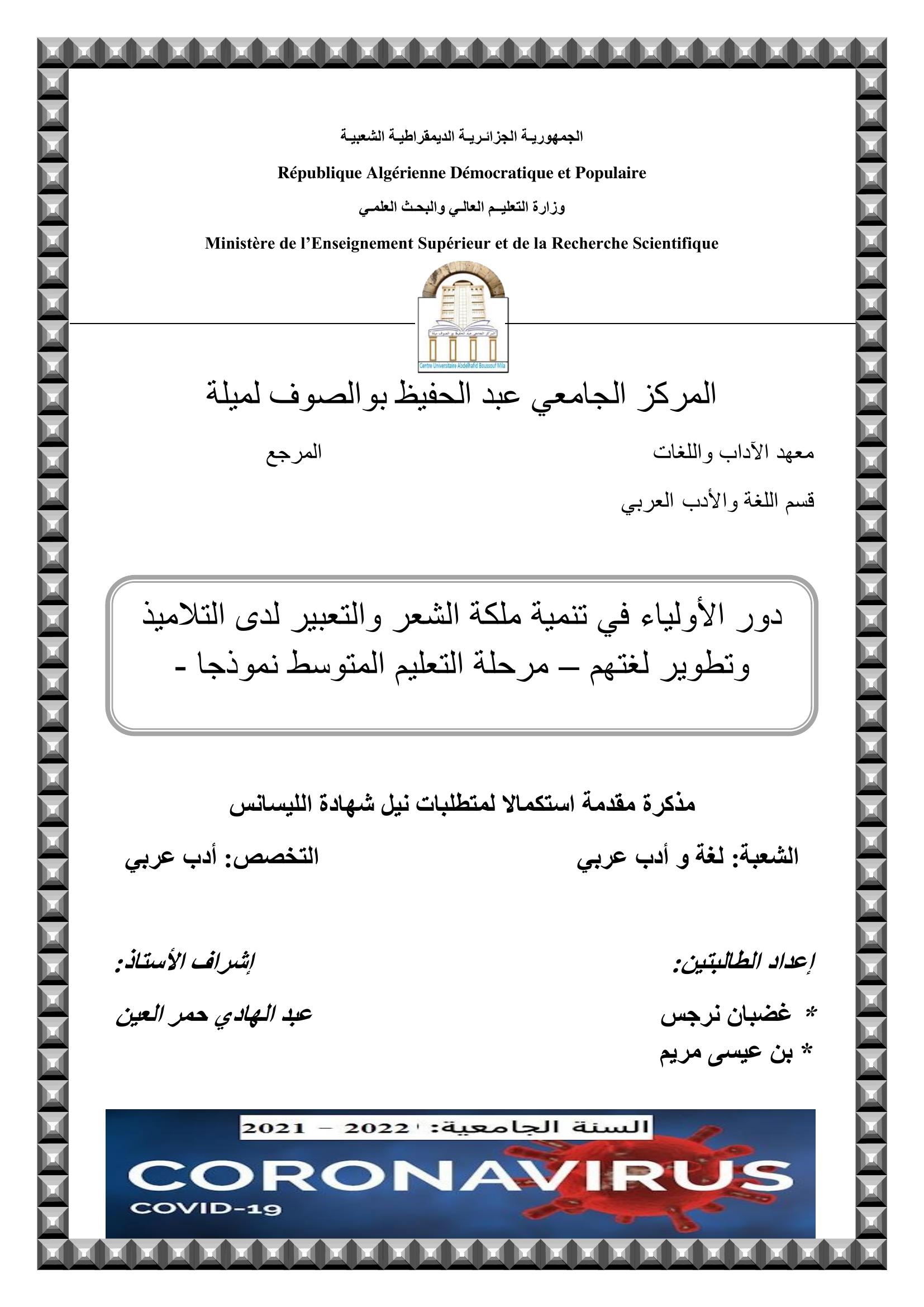دور الأولياء في تنمية ملكة الشعر والتعبير لدى التلاميذ وتطوير لغتهم -مرحلة التعليم المتوسط نموذجا