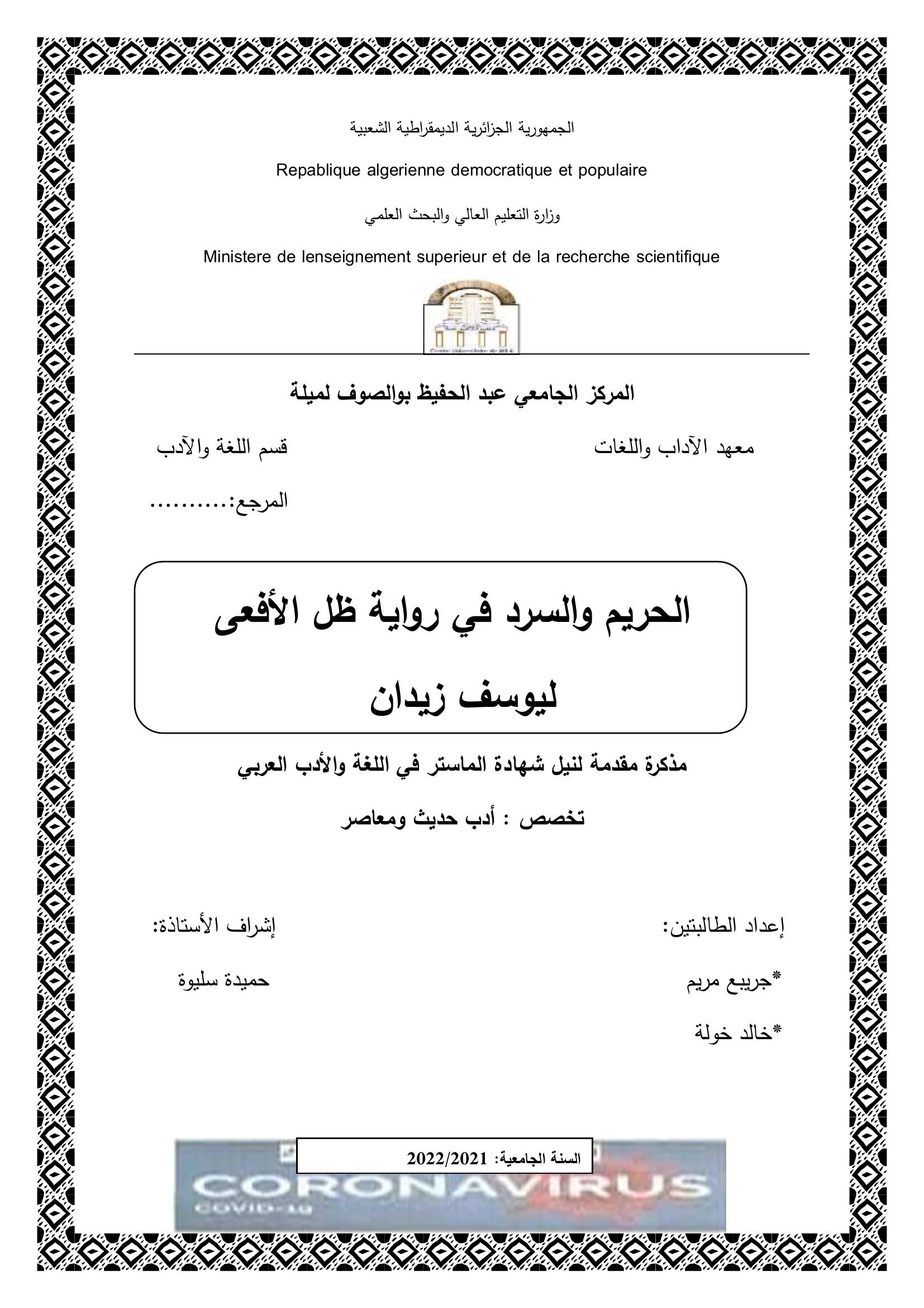 جريبع مريم et al. (2022). الحريم والسرد في رواية ظل الأفعى ليوسف زيدان.