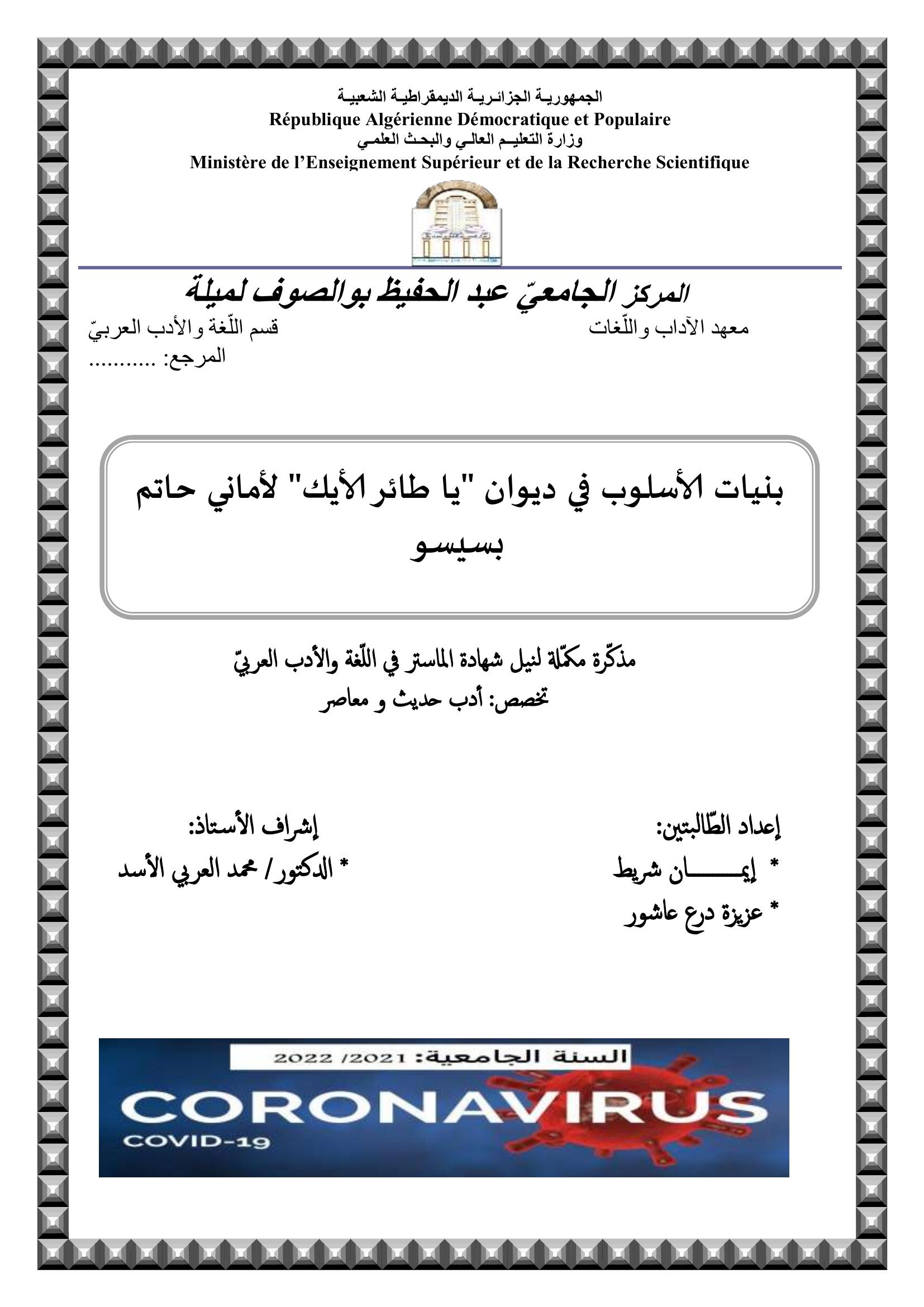 درع عاشور عزيزة et al. (2022). بنيات الأسلوب في ديوان ياطائر الأيك لأماني حاتم بسيسو.
