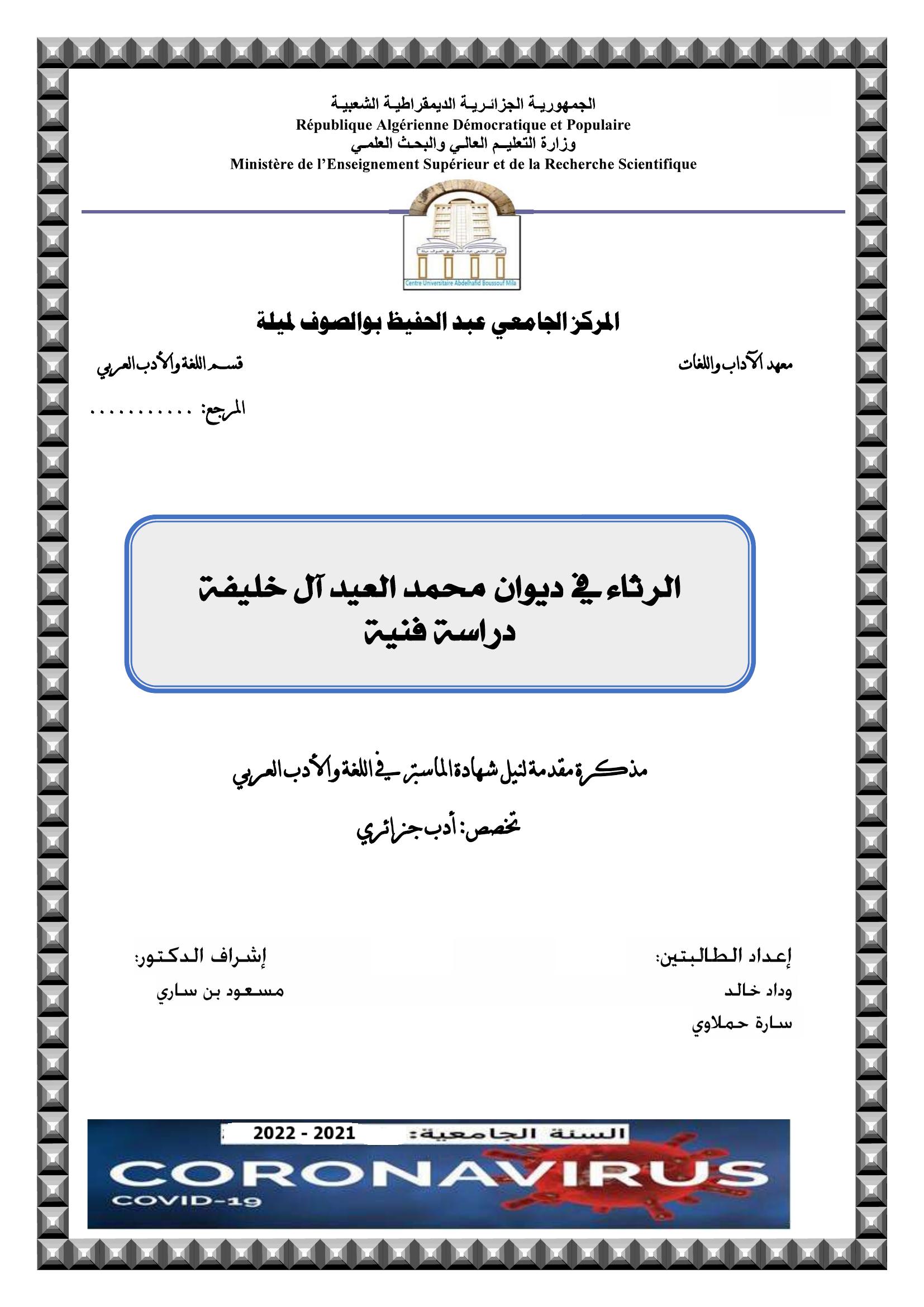 حملاوي سارة et al. (2022). الرثاء في ديوان محمد العيد آل خليفة -دراسة فنية-.