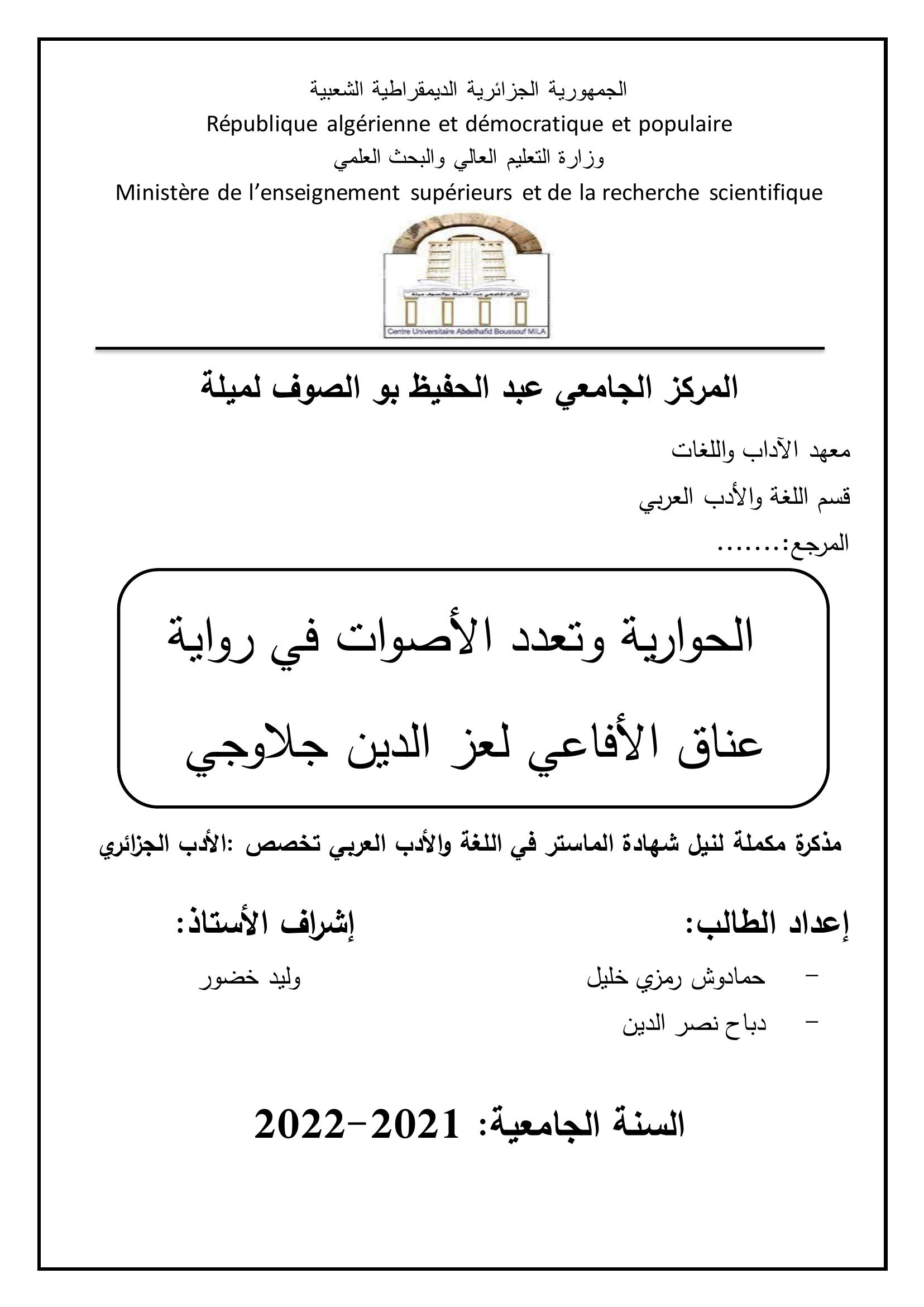 حمادوش رمزي خليل et al. (2022). الحوارية وتعدد الأصوات في رواية عناق الأفاعي لعز الدين جلاوجي.