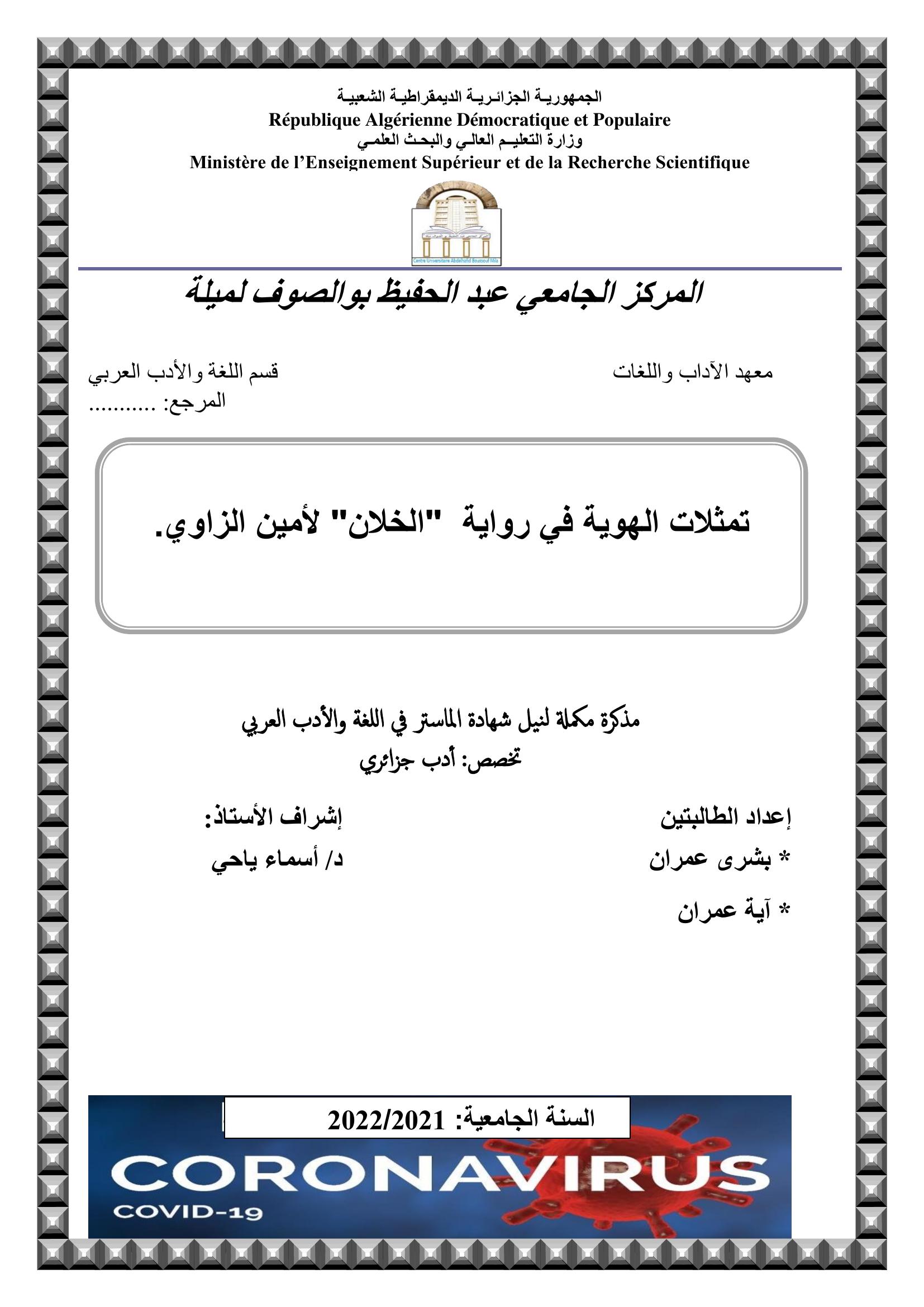 عمران آية et al. (2022). تمثلات الهوية في رواية الخلان لأمين الزاوي.