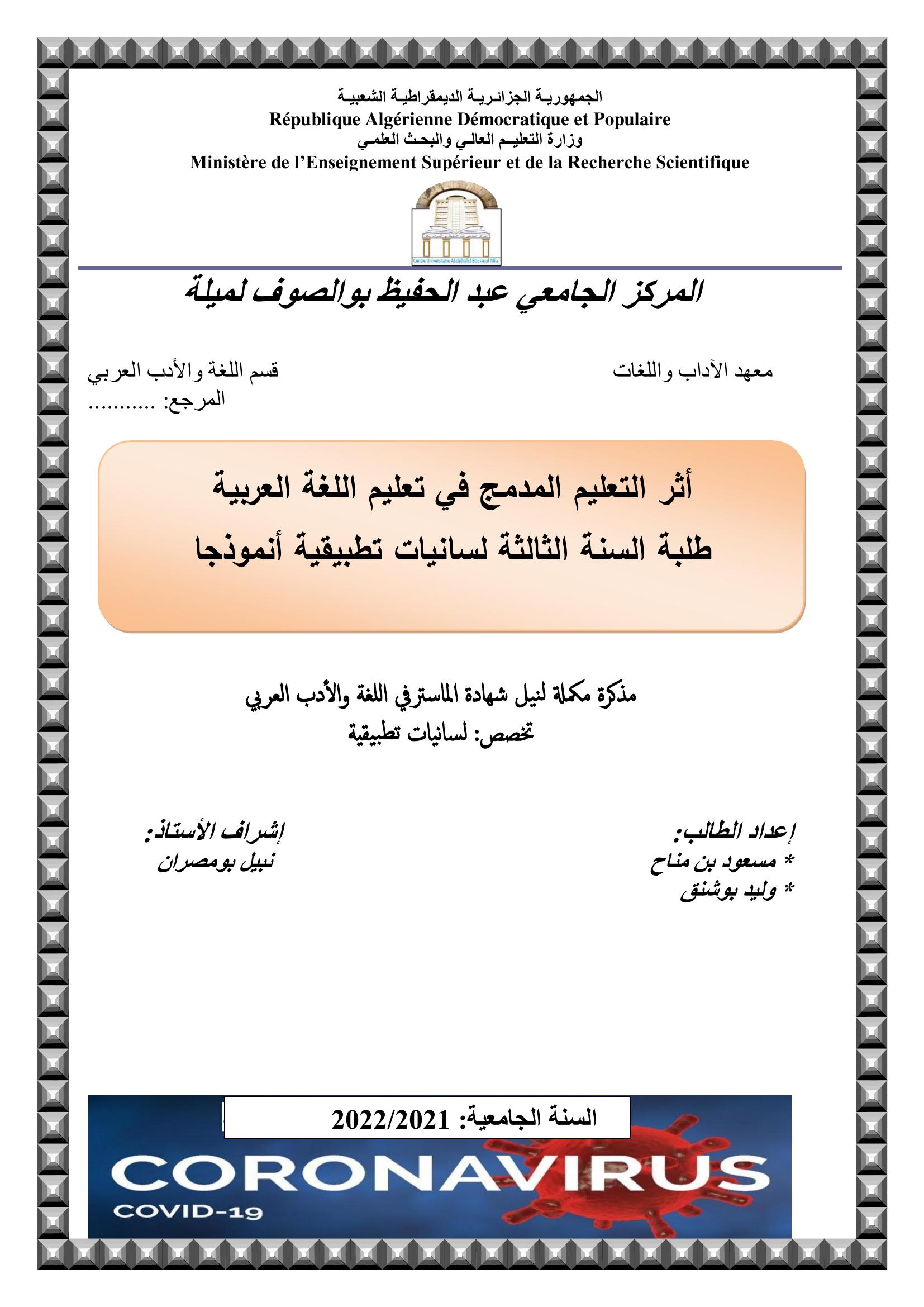 بوشنق وليد et al. (2022). أثر التعليم المدمج في تعليم اللغة العربية طلبة السنة الثالثة لسانيات تطبيقية أنموذجا.