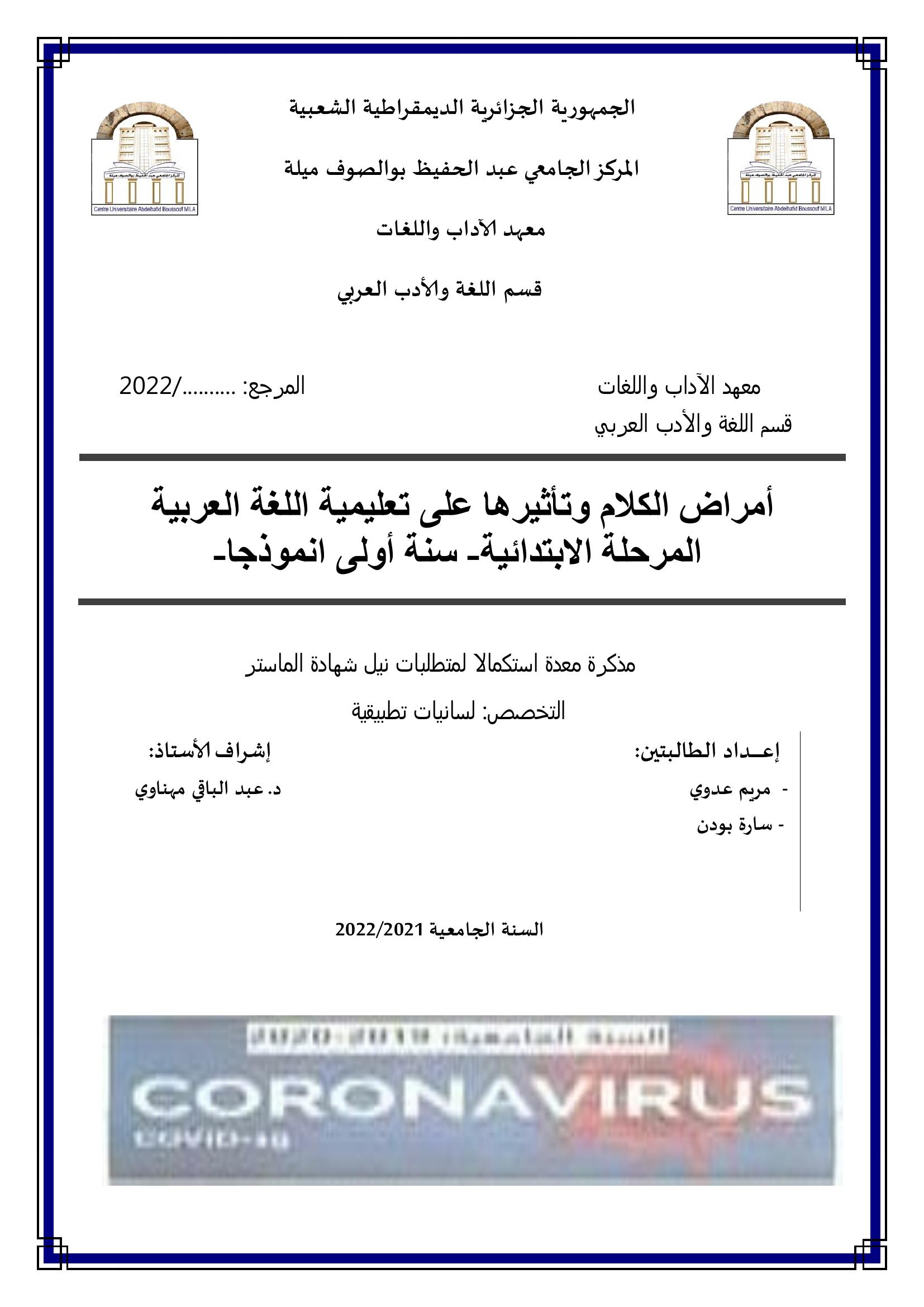 أمراض الكلام وتأثيرها على تعليمية اللغة العربية المرحلة الإبتدائية سنة أولى أنموذجا