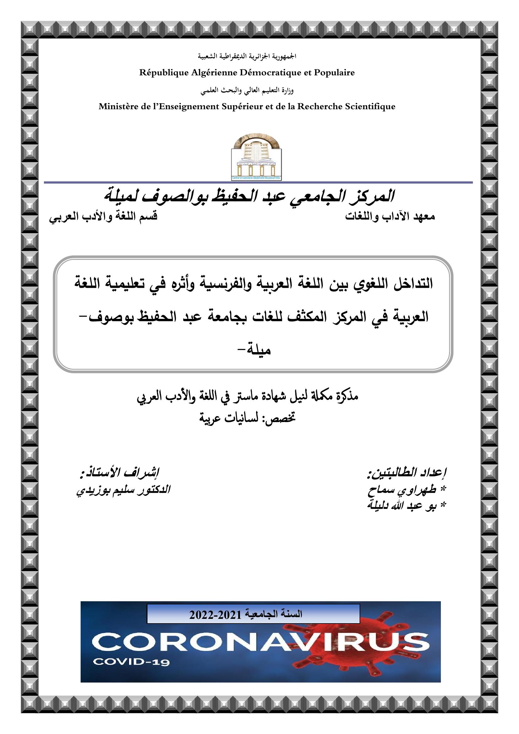 التداخل اللغوية بين اللغة العربية والفرنسية وأثره في تعليمية اللغة العربية في المركز المكثف للغات بجامعة عبد الحفيظ بوالصوف ميلة