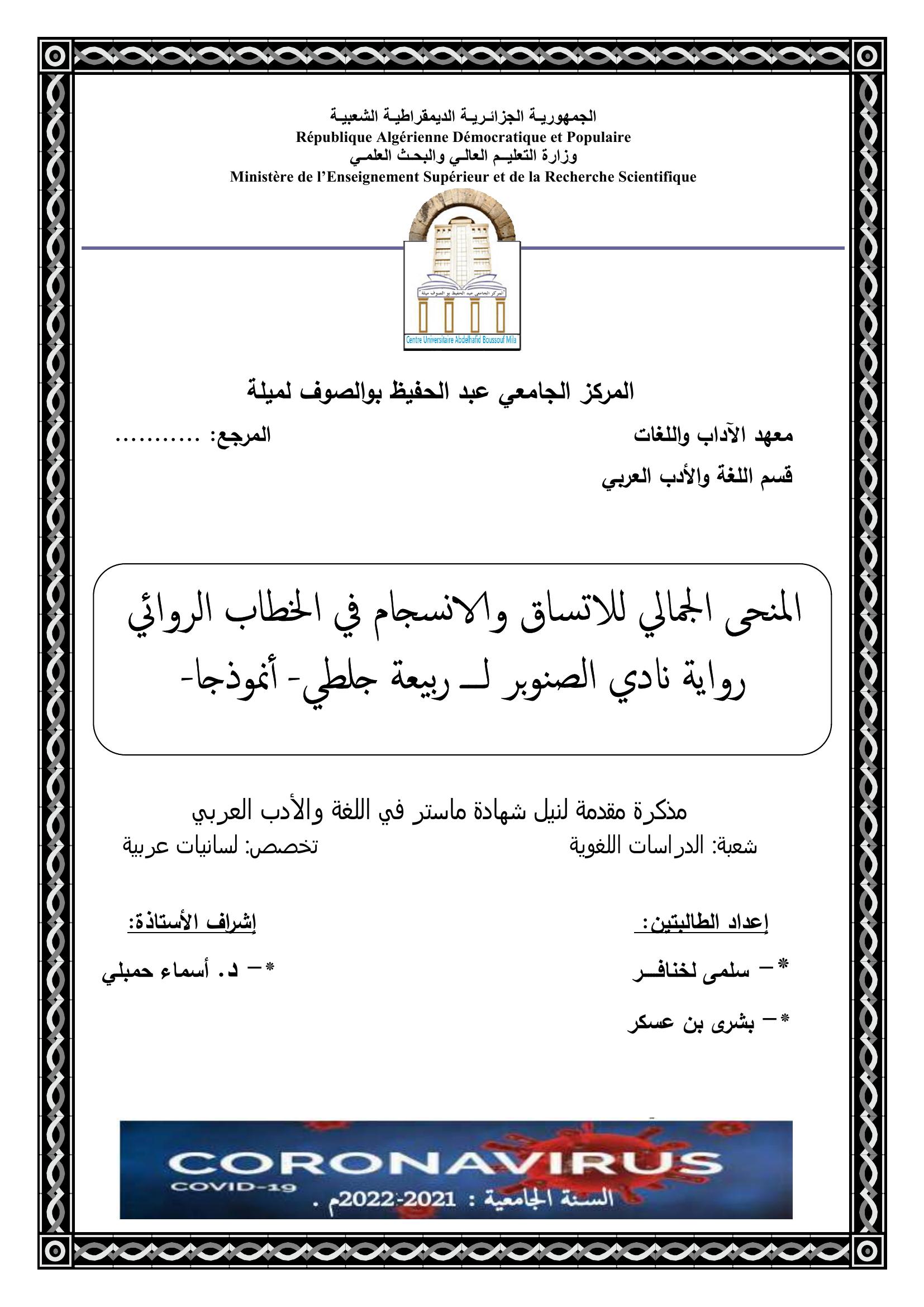 بن عسكر بشرى et al. (2022). المنحى الجمالي للإتساق والإنسجام في الخطاب الروائي رواية نادي الصنوبر لربيعة جلطي -أنموذجا-.