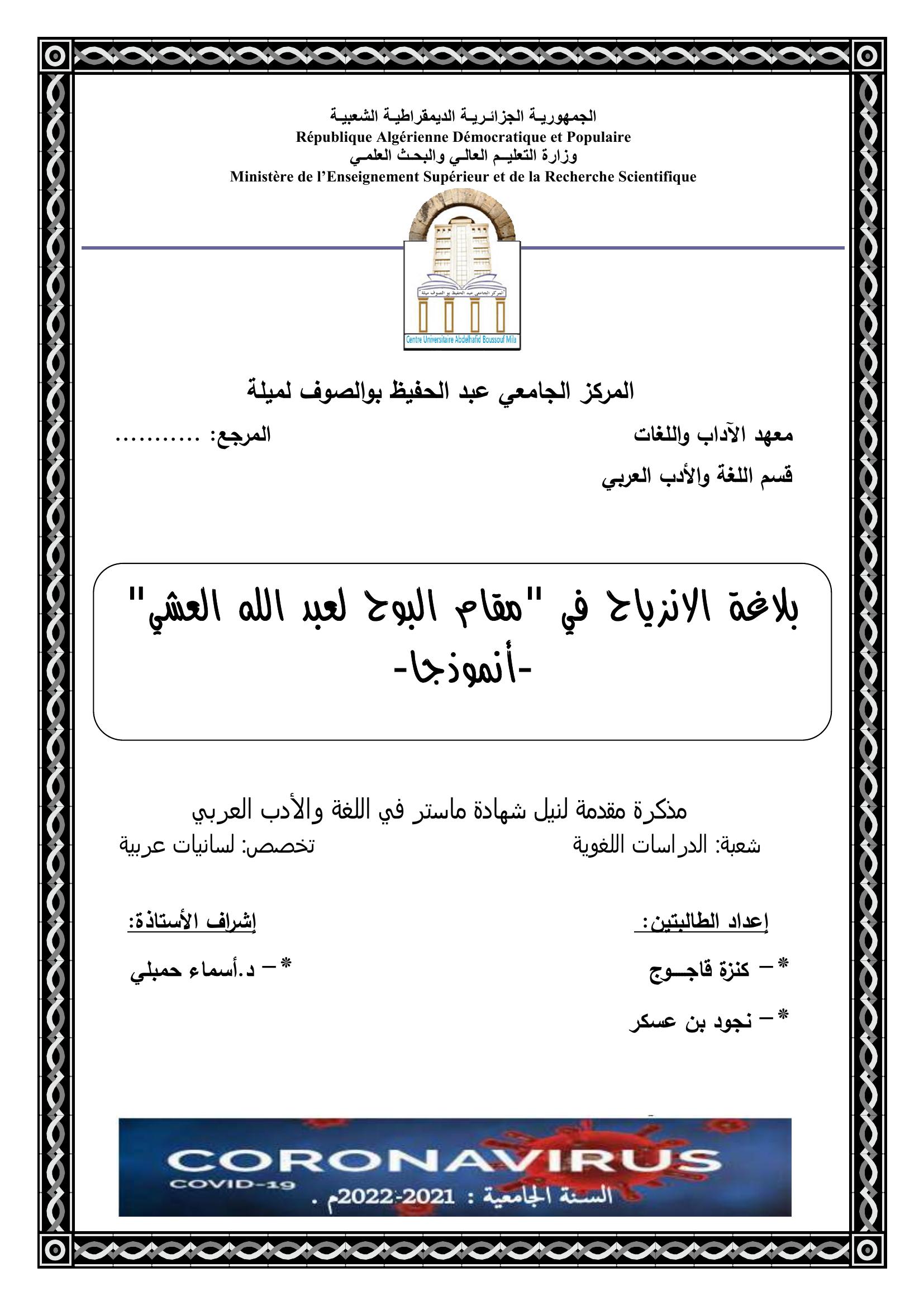 قاجوج كنزة et al. (2022). بلاغة الإنزياح في مقام البوح لعبد الله العشي أنموذجا.
