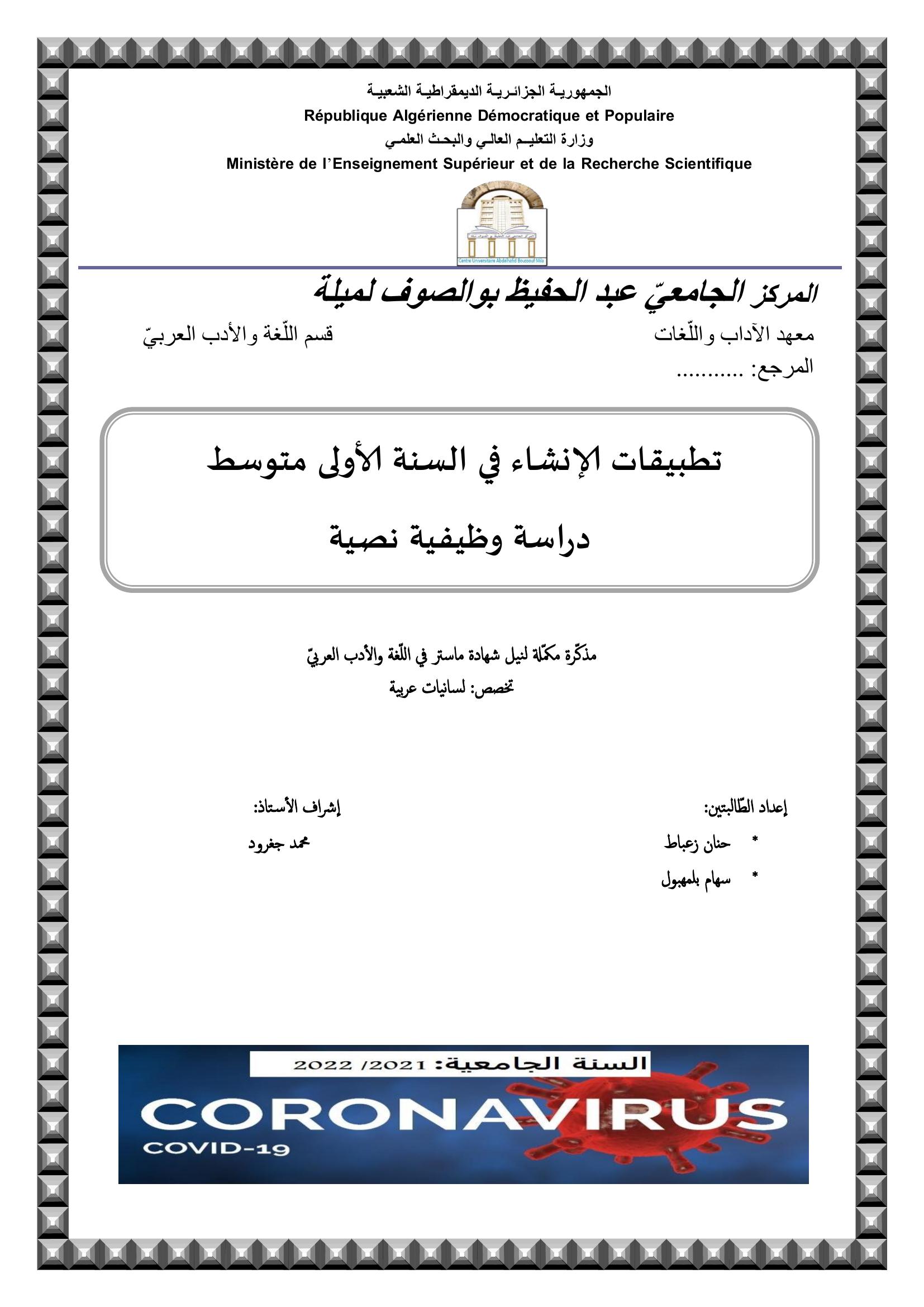 بلمهبول سهام et al. (2022). تطبيقات الإنشاء في السنة الاولى متوسط دراسة وظيفية نصية.