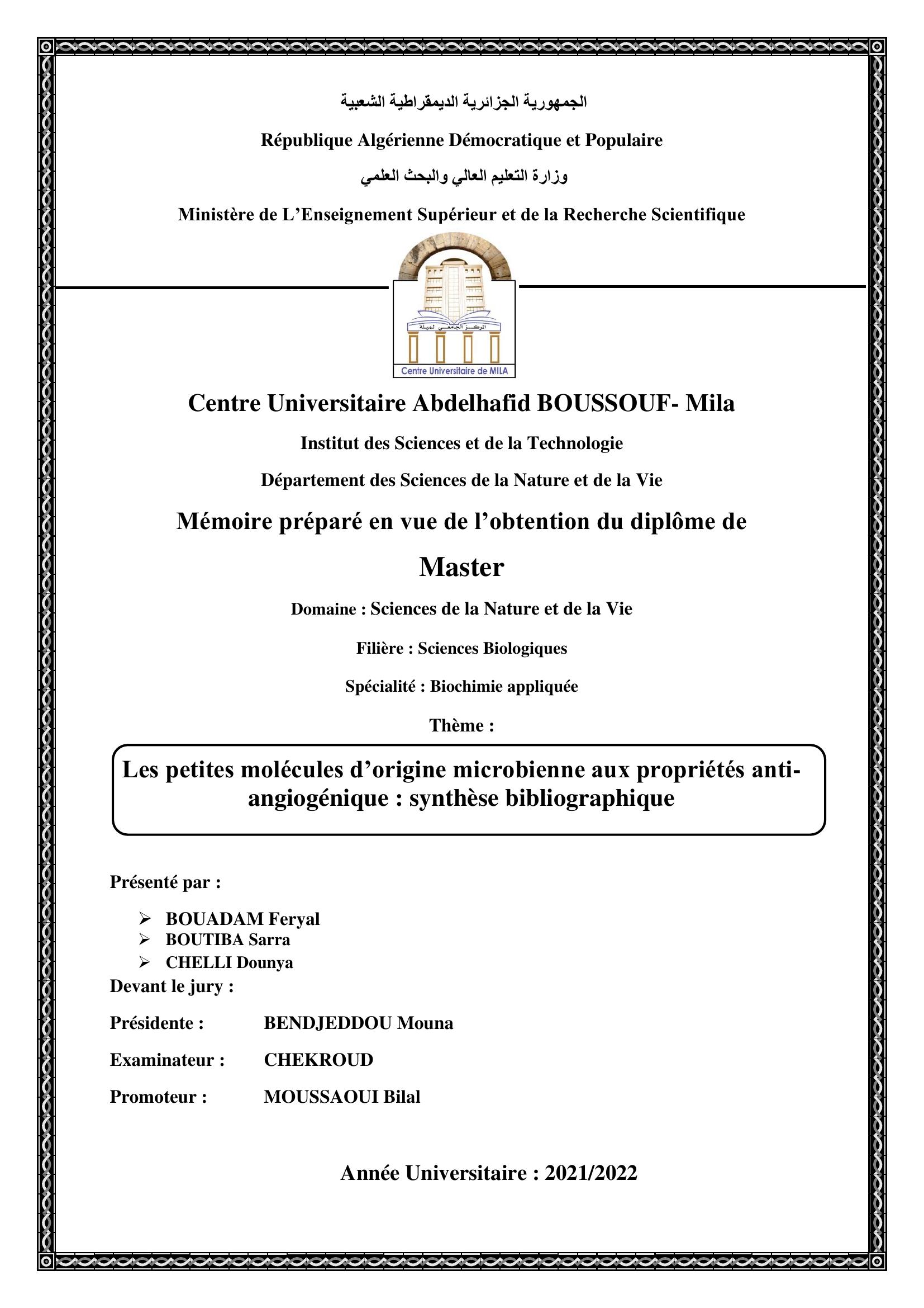 Boudam Feryal et al. (2022). Les petites molécules d'origine microbienne aux propriétés anti-angiogénique : synthèse bibliographique.