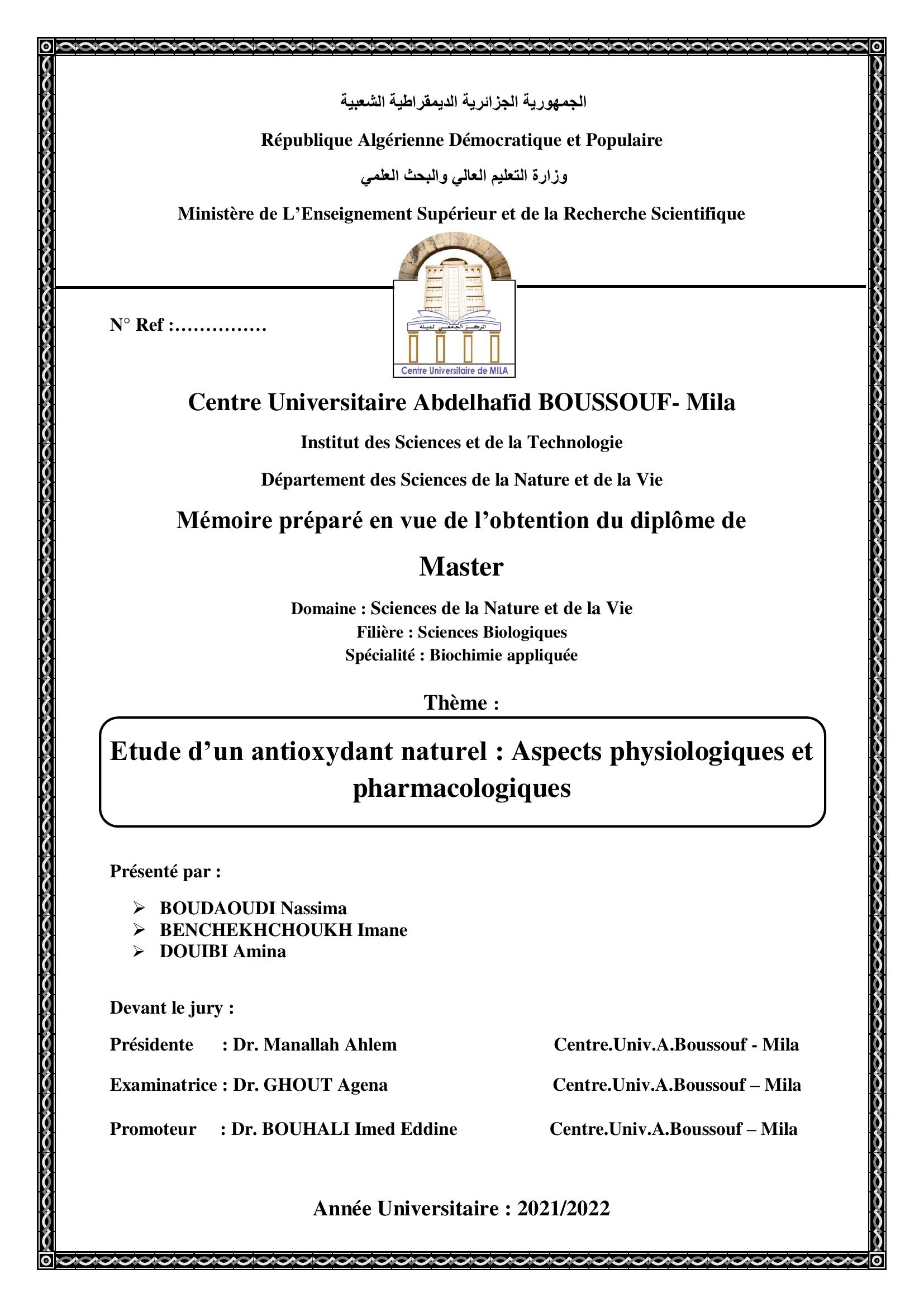 Boudoudi Nassima et al. (2022). Etude d'un antioxydant naturel : Aspects physiologiques et pharmacologiques.