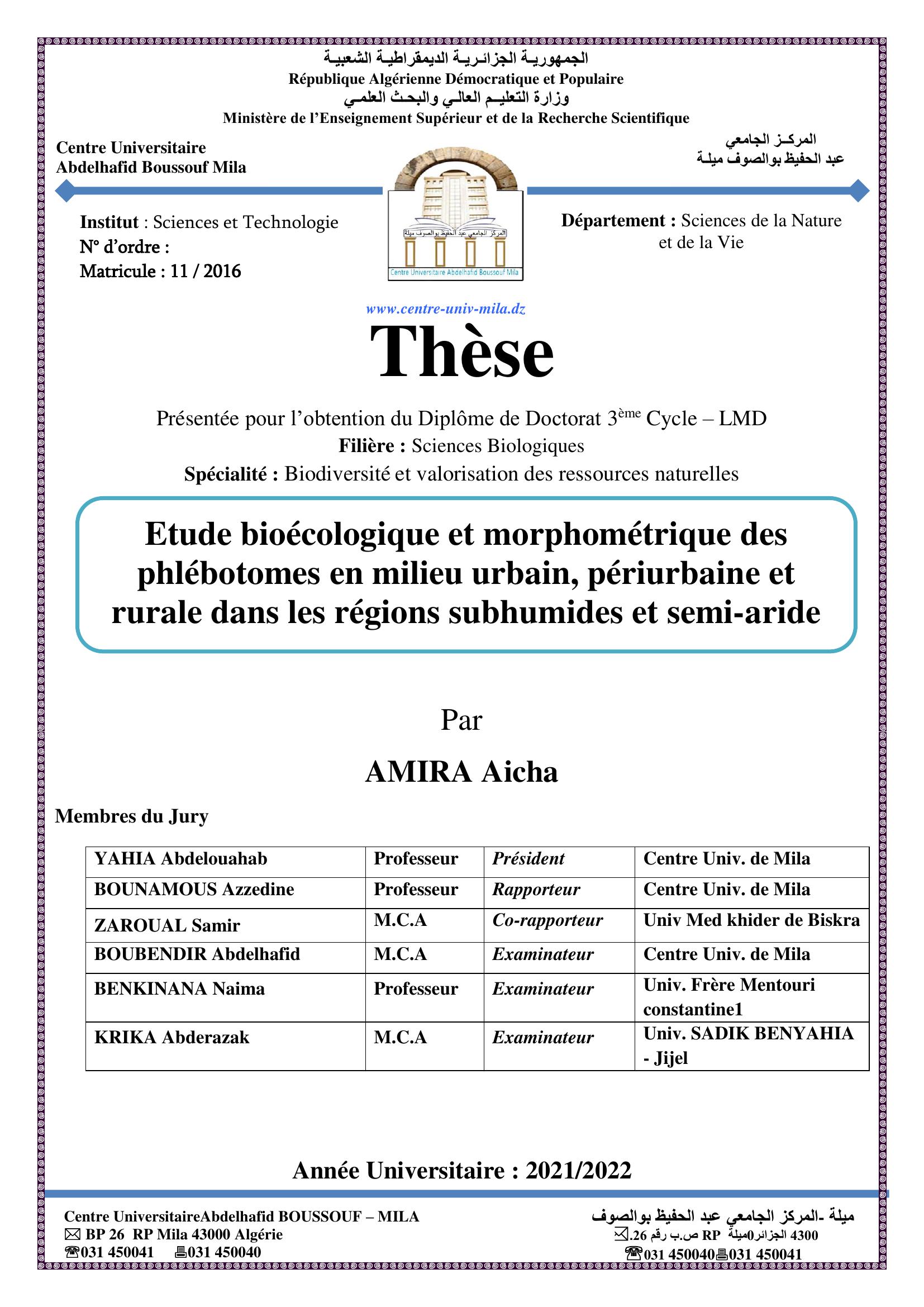 Etude bioécologique et morphométrique des phlébotomes en milieu urbain, périurbaine et rurale dans les régions subhumides et semi-aride