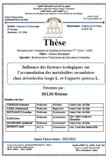 Influence des facteurs écologiques sur l’accumulation des métabolites secondaires chez Aristolochia longa L. et Capparis spinosa L