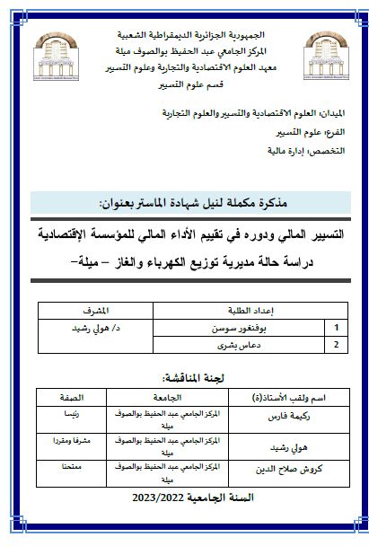 دعاس بشرى et al. (2023). التسيير المالي ودوره في تقييم الأداء المالي للمؤسسة الإقتصادية دراسة حالة مديرية توزيع الكهرباء والغاز ميلة (ماستر- ل م د) . المركز الجامعي عبد الحفيظ بوالصوف ميلة.