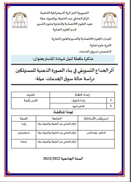 شقوف رندة et al. (2023). أثر الخداع التسويقي في بناء الصورة الذهنية للمستهلكين دراسة حالة سوق الخدمات ميلة- (ماستر- ل م د) . المركز الجامعي عبد الحفيظ بوالصوف ميلة.