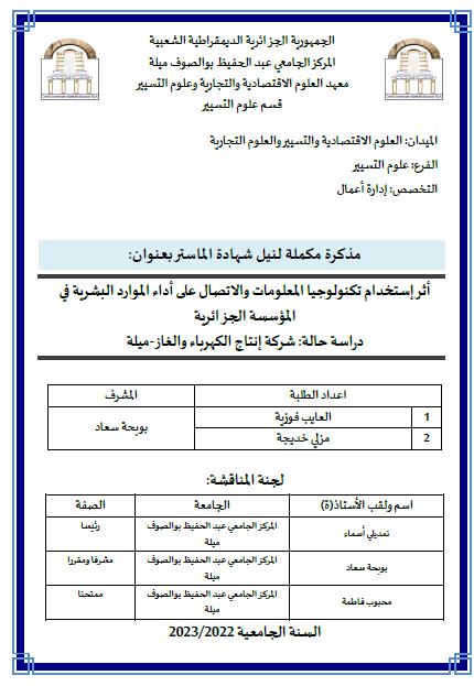 أثر إستخدام تكنولوجيا المعلومات والاتصال على أداء الموارد البشرية في المؤسسة الجزائرية دراسة حالة: شركة إنتاج الكهرباء والغاز ميلة