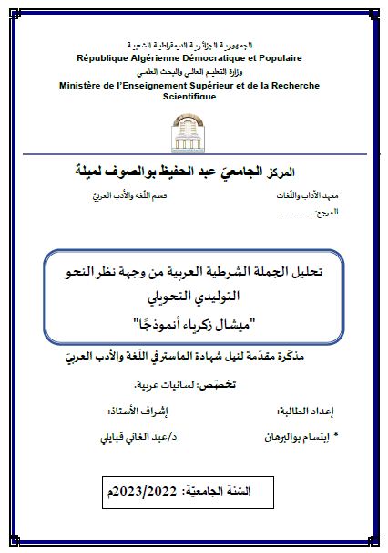 بوالبرهان ابتسام & قبايلي عبد الغاني (مشرفا) (2023). تحليل الجملة الشرطية العربية من وجهة نظر النحو التوليدي التحويلي (ماستر- ل م د) . المركز الجامعي عبد الحفيظ بوالصوف ميلة.