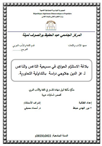 خياط نور الهدى & حمبلي أسماء(مشرفا) (2023). بلاغة الاستلزام الحواري في مسرحية التاعس والناعس لعز الدين جلاوجي دراسة في التداولية التحاورية (ماستر- ل م د) . المركز الجامعي عبد الحفيظ بوالصوف ميلة.