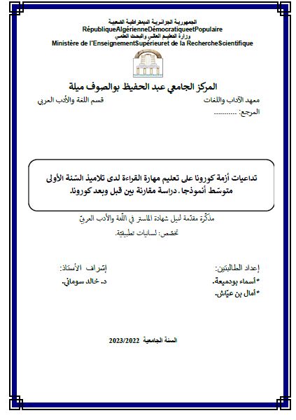 بودميعة أسماء et al. (2023). تداعيات أزمة كورونا على تعليم مهارة القراءة لدى تلاميذ السنة الاولى متوسط أنموذجا- دراسة مقارنة بين قبل و بعد كورونا (ماستر- ل م د) . المركز الجامعي عبد الحفيظ بوالصوف ميلة.