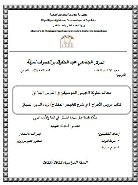 عزيز مريم et al. (2023). معالم نظرية الجرس الموسيقي في الدرس البلاغي كتاب عروس الأفراح في شرح تلخيص المفتاح لبهاء الدين السبكي (ماستر- ل م د) . المركز الجامعي عبد الحفيظ بوالصوف ميلة.
