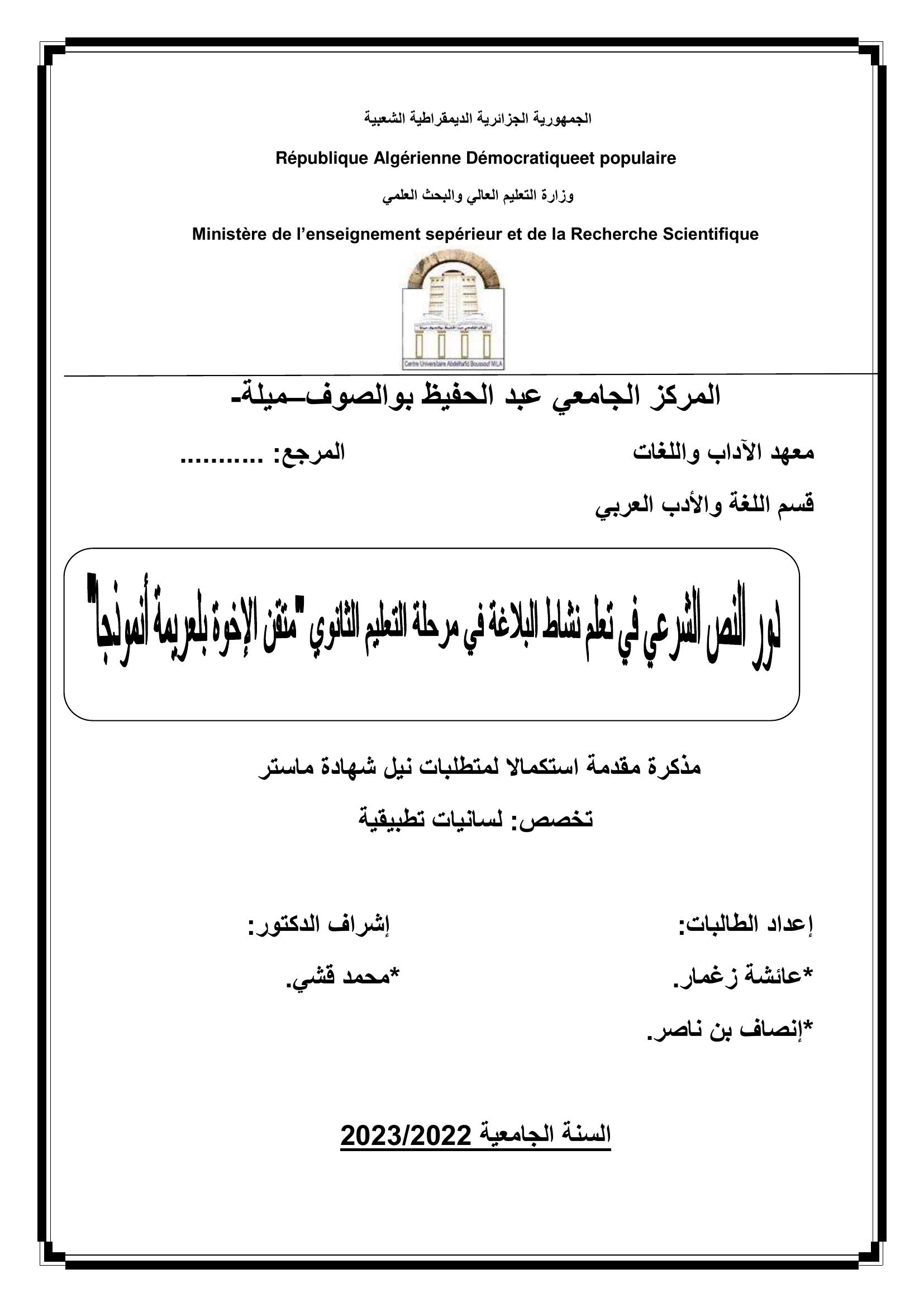 زغمار عائشة et al. (2023). دور النص الشرعي في تعلم نشاط البلاغة لدى تلاميذ مرحلة التعليم الثانوي متقن الإخوة بلعريمة بولاية ميلة أنموذجا (ماستر- ل م د) . المركز الجامعي عبد الحفيظ بوالصوف ميلة.