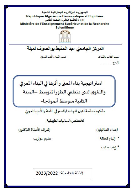 كحالة إلهام et al. (2023). إستراتيجية بناء المعنى وأثرها في البناء المعرفي واللغوي لدى متعلمي الطور المتوسط - السنة الثانية (ماستر- ل م د) . المركز الجامعي عبد الحفيظ بوالصوف ميلة.