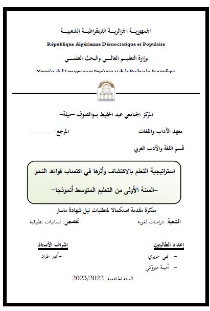 أمينة مبروكي et al. (2023). استراتيجية التعلم بالاكتشاف وأثرها في اكتساب قواعد النحو - السنة الأولى متوسط أنموذجا- (ماستر- ل م د) . المركز الجامعي عبد الحفيظ بوالصوف ميلة.