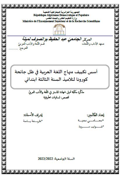 حمامي سمية et al. (2023). أسس تكييف مناهج اللغة العربية في ظل جائحة كورونا لتلاميذ السنة الثالثة ابتدائي (ماستر- ل م د) . المركز الجامعي عبد الحفيظ بوالصوف ميلة.