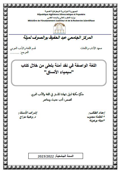 مجدوب فاطمة et al. (2023). اللغة الواصفة في نقد امنة بلعلى من خلال كتاب سيمياء الأنساق (ماستر- ل م د) . المركز الجامعي عبد الحفيظ بوالصوف ميلة.