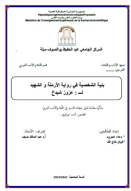 عجرود دعاء et al. (2023). بنية الشخصية في رواية " الأرملة والشهيد " لعزوز شيدخ (ماستر- ل م د) . المركز الجامعي عبد الحفيظ بوالصوف ميلة.