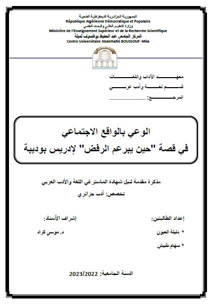 العيون دليلة et al. (2023). الوعي بالواقع الاجتماعي في قصة "ويبرع الرفض" لادريس بوذيبة (ماستر- ل م د) . المركز الجامعي عبد الحفيظ بوالصوف ميلة.