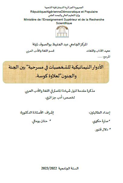 حكيري سارة et al. (2023). الادوار التيماتيكية للشخصيات في مسرحية "بين الجنة والجنون " لعلاوة كوسة . (ماستر- ل م د) . المركز الجامعي عبد الحفيظ بوالصوف ميلة.