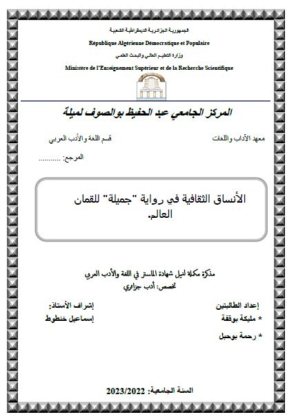 بوقفة مليكة et al. (2023). الأنساق الثقافية في رواية "جميلة " للقمان العالم (ماستر- ل م د) . المركز الجامعي عبد الحفيظ بوالصوف ميلة.