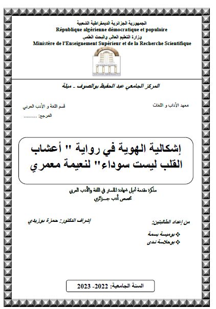 بوحلاسة ندى et al. (2023). اشكالية الهوية في رواية "اعشاب القلب ليست سوداء " لنعيمة معمري (ماستر- ل م د) . المركز الجامعي عبد الحفيظ بوالصوف ميلة.
