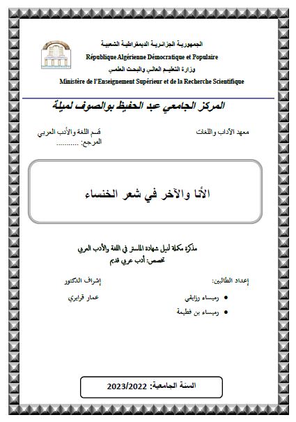 بن فطيمة رميساء et al. (2023). الأنا والآخر في شعر الخنساء (ماستر- ل م د) . المركز الجامعي عبد الحفيظ بوالصوف ميلة.