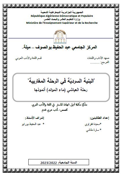 طاشي سارة et al. (2023). البنية السردية في الرحلة المغاربية -رحلة العياشي(ماء الموائد) أنموذجا- (ماستر- ل م د) . المركز الجامعي عبد الحفيظ بوالصوف ميلة.