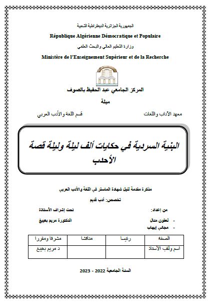 لعقون منال et al. (2023). البنية السردية في حكايات ألف ليلة وليلة قصة" الأحدب" (ماستر- ل م د) . المركز الجامعي عبد الحفيظ بوالصوف ميلة.