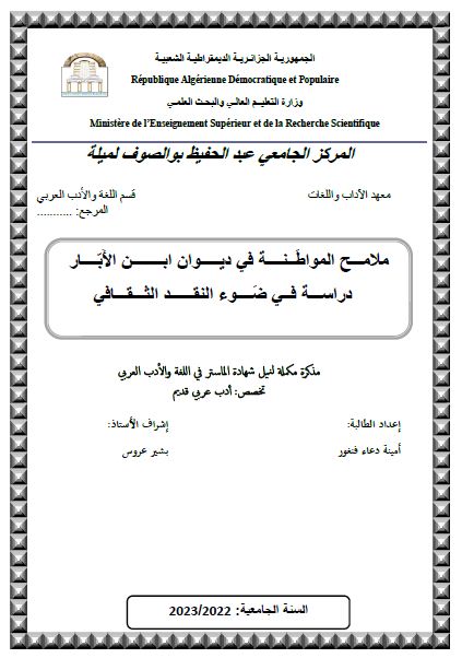 فنغور أمينة دعاء & عروس بشير(مشرفا) (2023). ملامح المواطنة في ديوان ابن الأبّار دراسة في ضوء النقد الثقافي (ماستر- ل م د) . المركز الجامعي عبد الحفيظ بوالصوف ميلة.