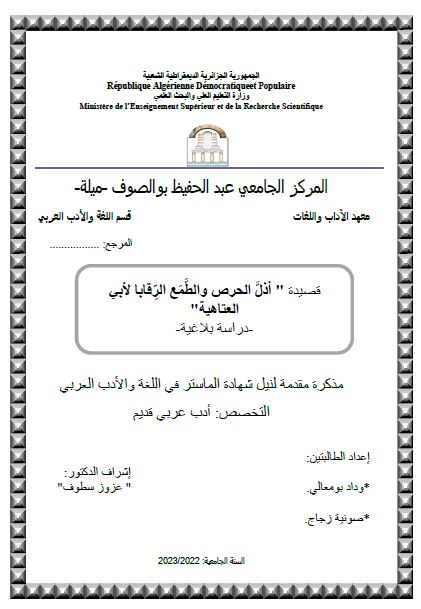 زجاج صونية et al. (2023). قصيدة أذلَّ الحرصُ والطمعُ الرقابا" لأبي العتاهية دراسة بلاغية (ماستر- ل م د) . المركز الجامعي عبد الحفيظ بوالصوف ميلة.