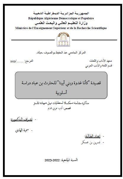بن عسكر نسرين & الهادي سمية (مشرفا) (2023). قصيدة "كأنا غدوة وبني أبينا" للحارث بن عباد دراسة أسلوبية (ماستر- ل م د) .