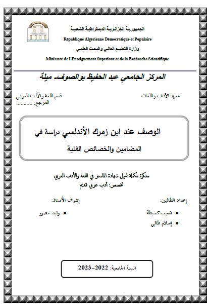 كسيطة شعيب et al. (2023). الوصف عند ابن زمرك الأندلسي دراسة في المضامين والخصائص الفنية (ماستر- ل م د) . المركز الجامعي عبد الحفيظ بوالصوف ميلة.